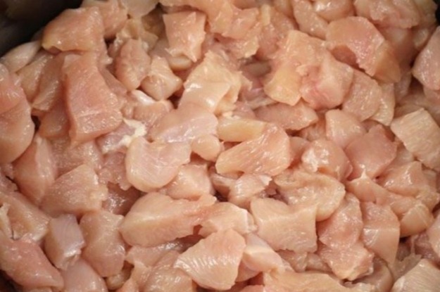 Step 1: Lay the chopped chicken snugly at the base of a 4-quart slow cooker.
