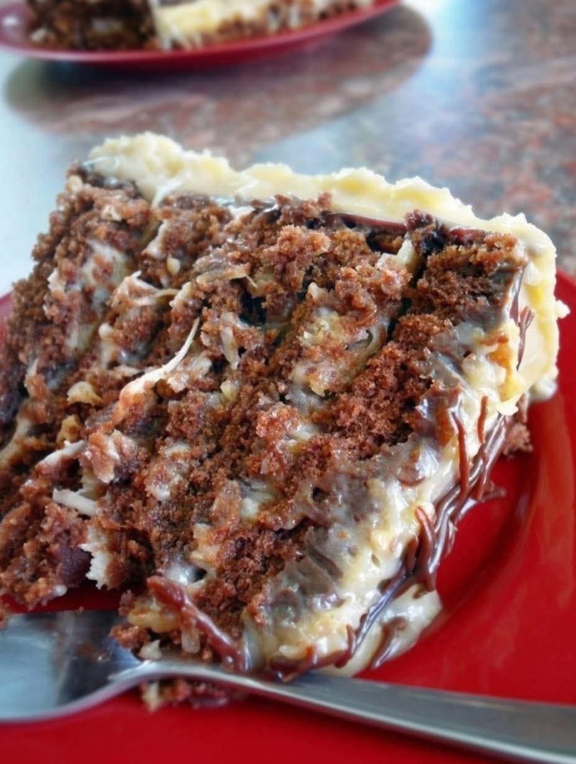 coconut pecan frosting and luscious chocolate frosting. The cake is ultra-moist with a