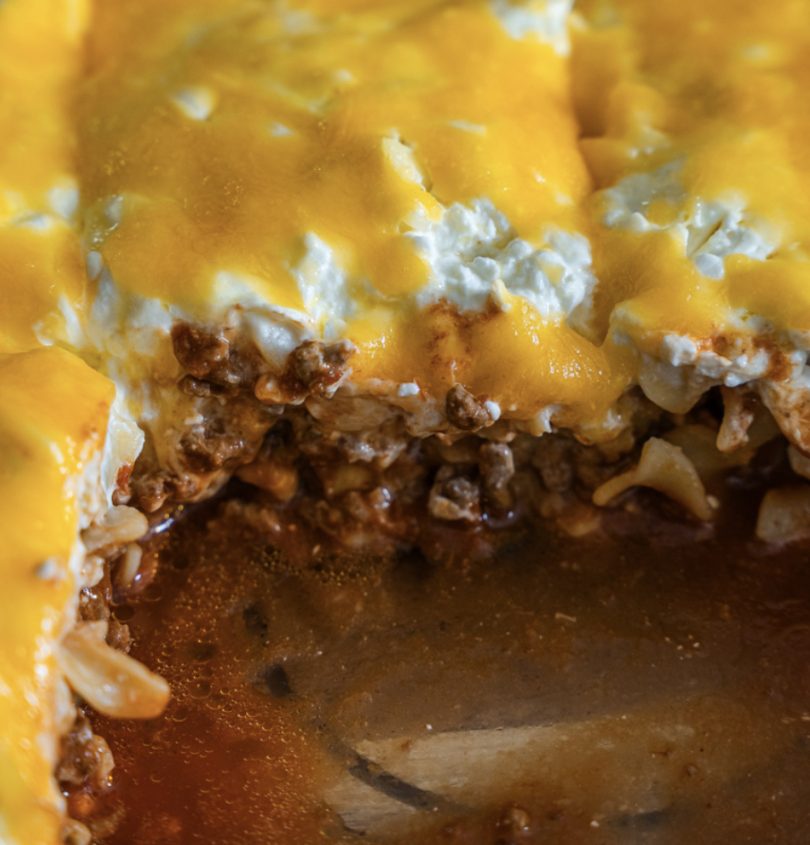 Spread half of the cooked egg noodles evenly in the bottom of the prepared dish. Spoon the beef mixture over the noodles and spread evenly. Top with remaining noodles. -