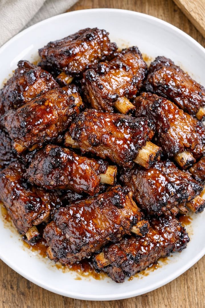 Transfer ribs to a plate. Pour cooking liquid into a saucepan, skim excess fat, and simmer for 8–12 minutes until thickened into a sticky glaze.