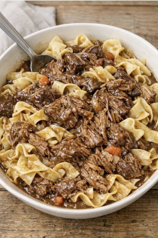 The result is melt-in-your-mouth beef coated in a thick, savory gravy that pairs perfectly with soft, buttery noodles. It’s rustic, satisfying, and deeply comforting.