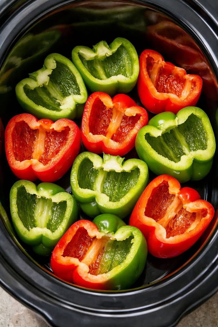 - Place halved bell peppers cut-side up in the slow cooker, fitting them snugly.