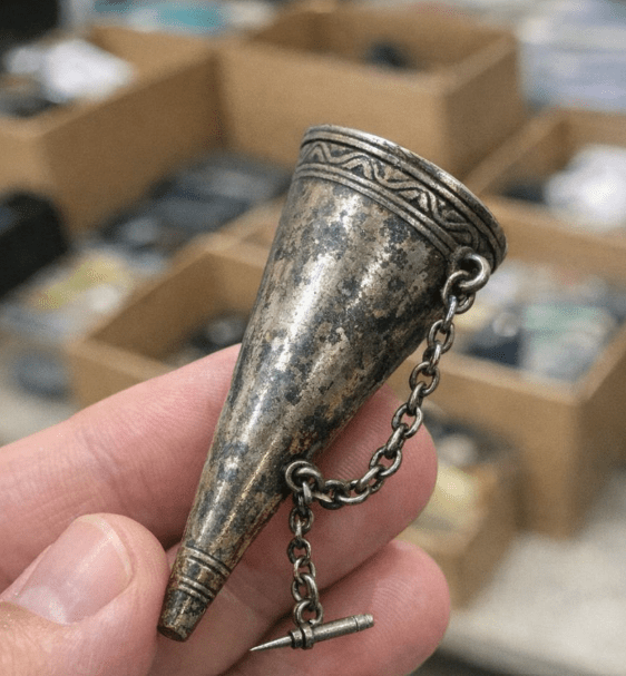 Rummage sales often hold unexpected treasures, and occasionally, a single curious object can open the door to an entire chapter of history. One such discovery—a small, ornate metal cone with a delicate chain, pin, and a folding tripod handle—may appear puzzling at first glance. However, a closer look reveals that this intriguing piece is far more than decorative; it is a glimpse into the elegance and social customs of the Victorian era.