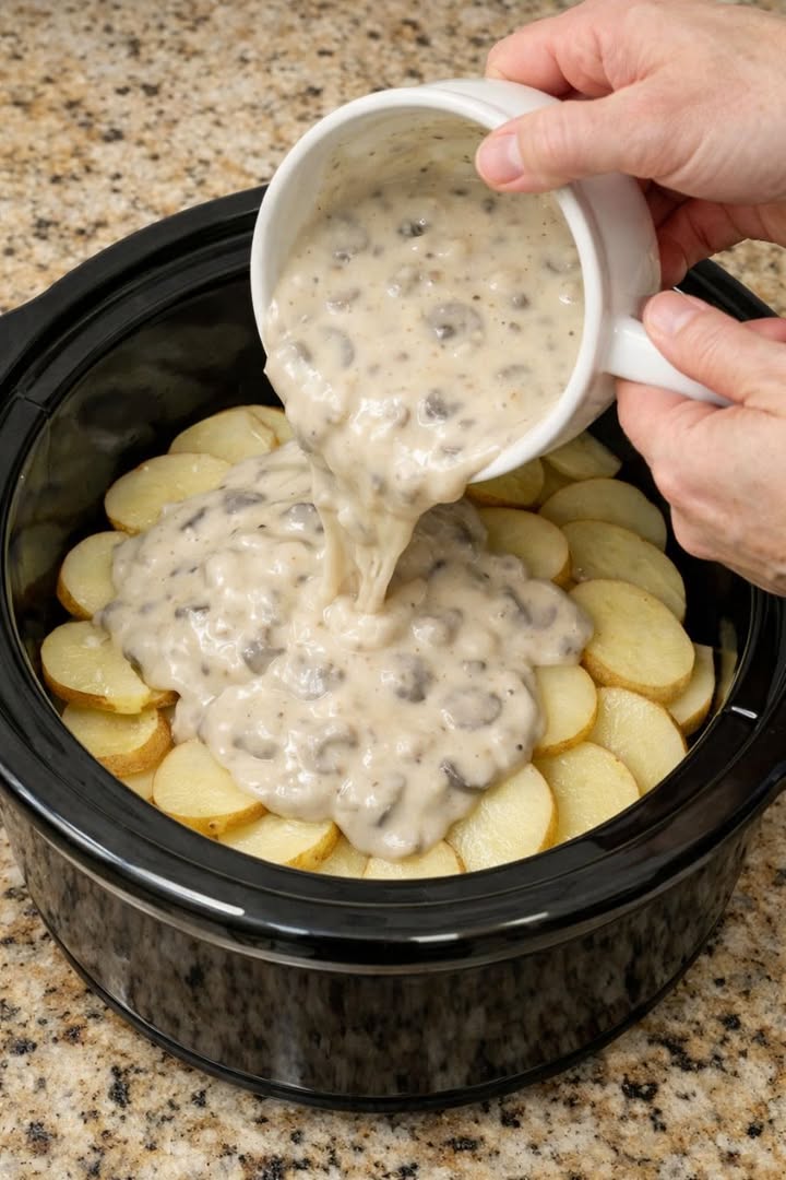 Pour the soup mixture evenly over the layers, making sure it seeps down between the potatoes.