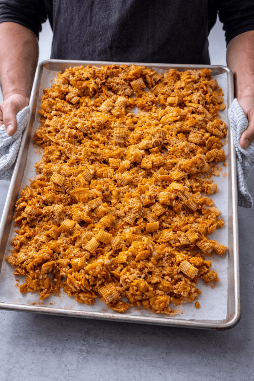 Spread the caramel-coated cereal in a single, even layer across the prepared parchment-lined baking sheet. Try to avoid large clumps — a flatter, more even spread produces more consistently crunchy pieces with better caramel coverage. Bake on the center rack for 7 to 9 minutes. You are not trying to brown the cereal — you are setting the caramel coating so it hardens into a crisp, snappy shell.