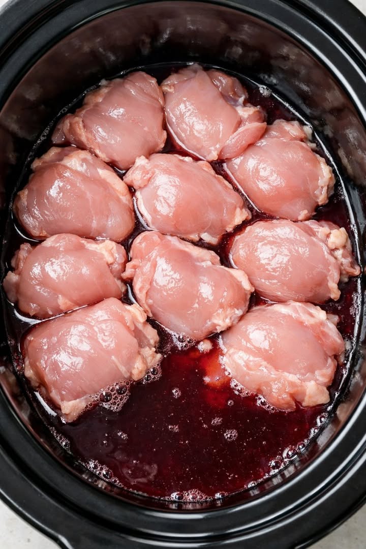 Place the chicken thighs in a single, slightly overlapping layer across the bottom of the slow cooker. They will naturally nestle together — it is fine for them to touch or overlap slightly. Just avoid stacking them in multiple thick layers, which can prevent even cooking.