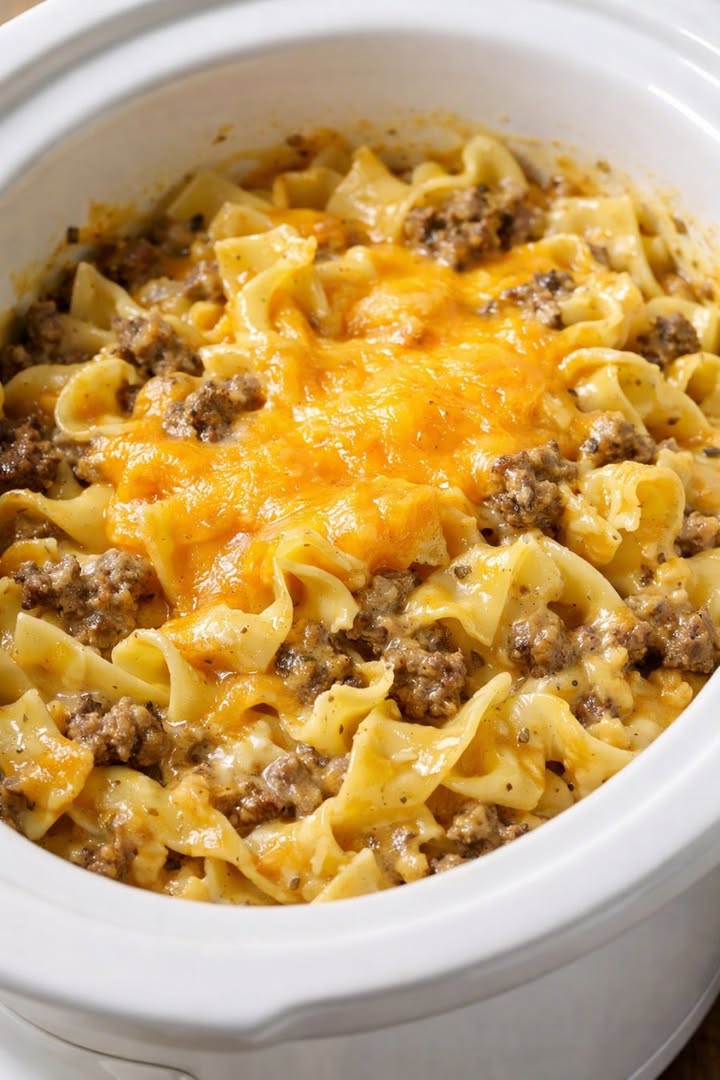 - The noodles cook directly in the sauce. No pre-boiling, no draining — the dry egg noodles go into the slow cooker and absorb the creamy, cheesy sauce as they cook, emerging with a flavor and texture they simply cannot achieve when boiled separately.